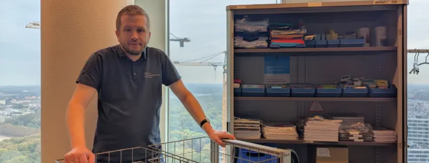 Patrick houdt van gestructureerd werken. Maandag en dinsdag staat in het teken van de voorraadkasten: inventariseren, bijvullen en controleren. Hij loopt met een klein schriftje langs alle verdiepingen, noteert wat bijgevuld moet worden en zorgt dat alles netjes op zijn plek komt. Soms zijn zijn bakjes iets te vol want hij wil voorkomen dat iemand mis grijpt. Maar met duidelijke foto-instructies en aantallen in de kast wordt het overzicht goed bewaakt, zowel voor Patrick als voor de Rijksambtenaren.